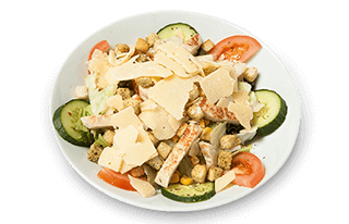 Salate der Saison mit Mais, Croutons, gebratenes Hähnchenbrustfilet, geraspeltem Grana Padano (Parmesan)