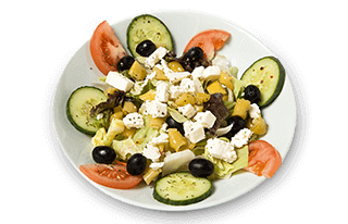 gemischte Blattsalate, Tomaten, Gurken, Mangowürfel, Hirtenkäse, Walnusskerne, Oliven