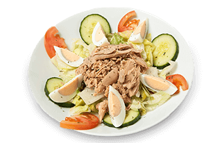Salate der Saison mit Mais, Croutons, gebratenes Hähnchenbrustfilet, geraspeltem Grana Padano (Parmesan)